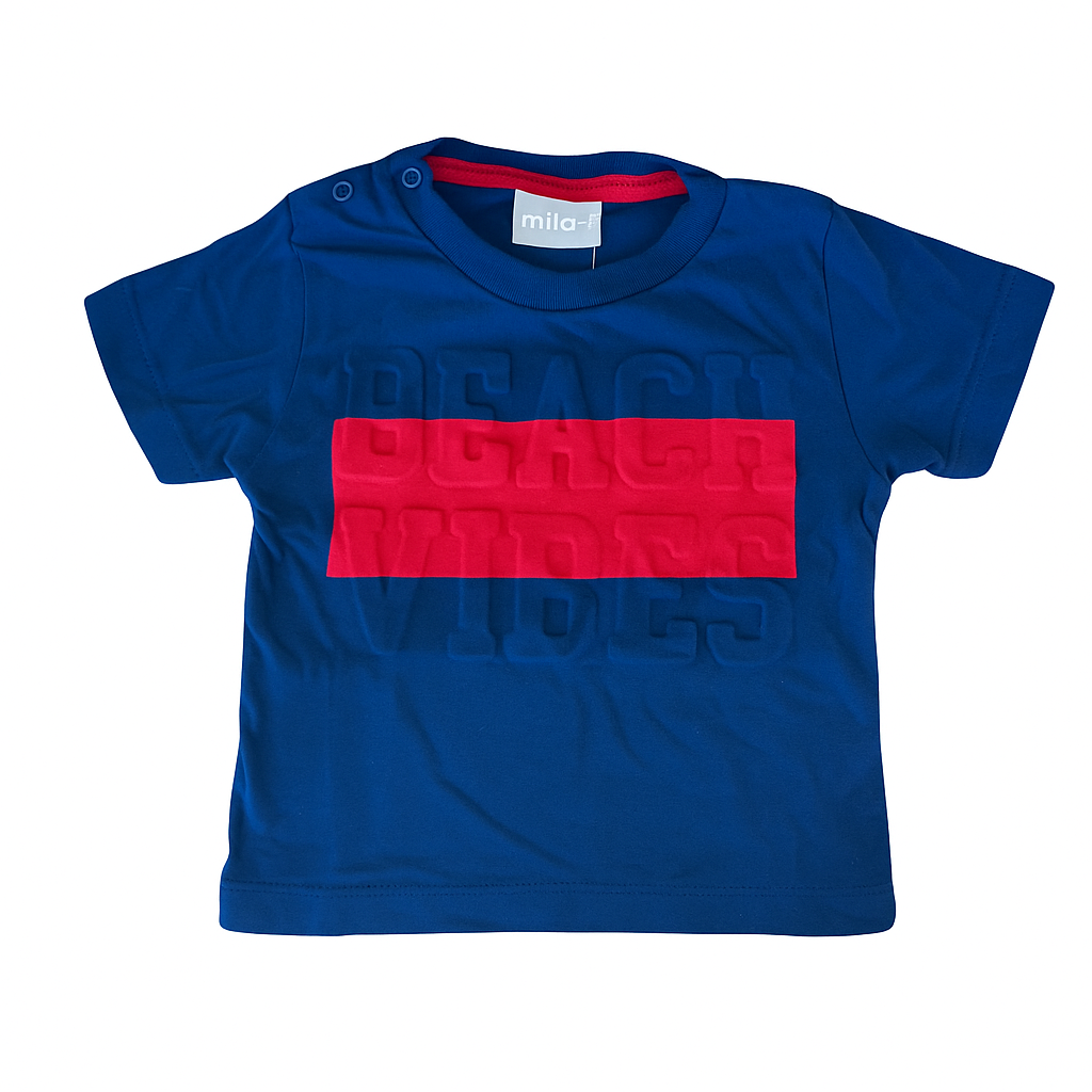 Na cor azul, possui uma estampa frontal em relevo vermelho com a frase "BEACH VIBES", adicionando um toque de estilo e textura. Os botões de pressão no ombro facilitam o vestir e o trocar.