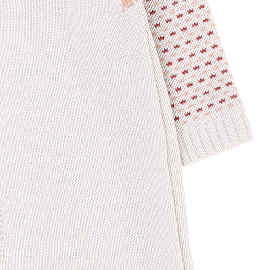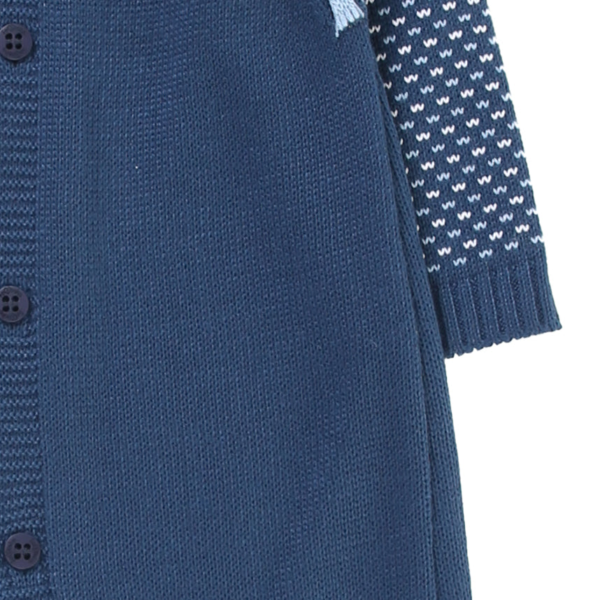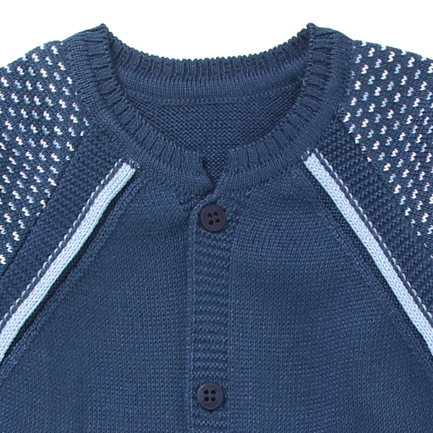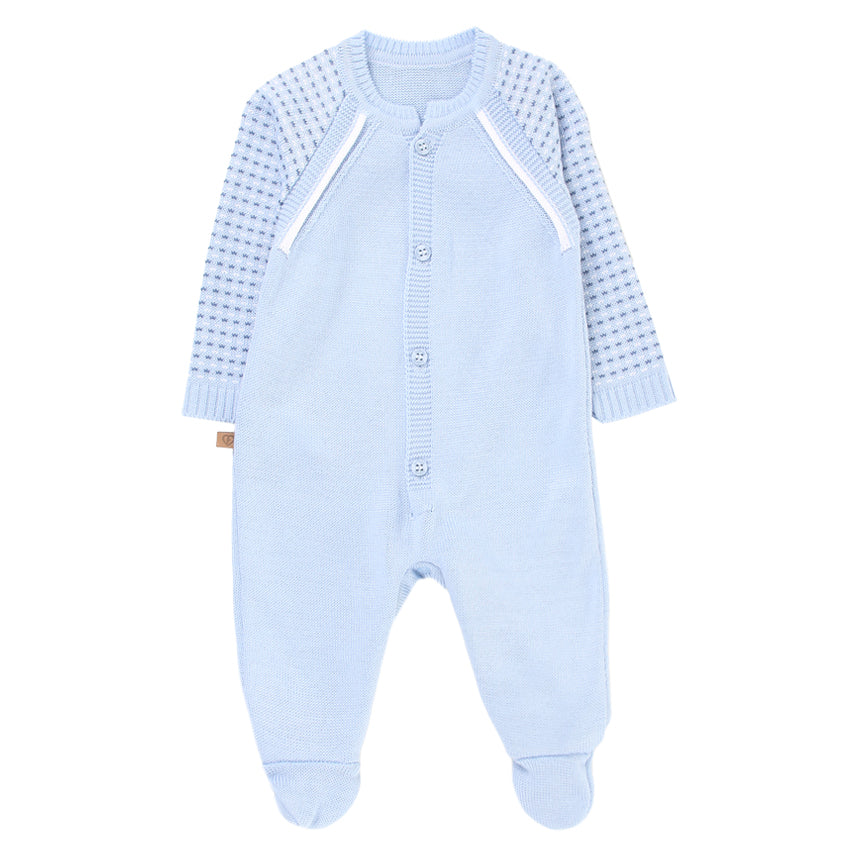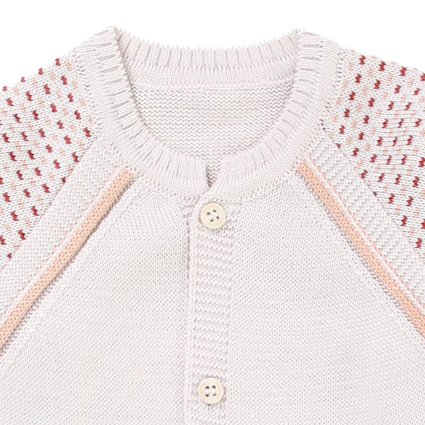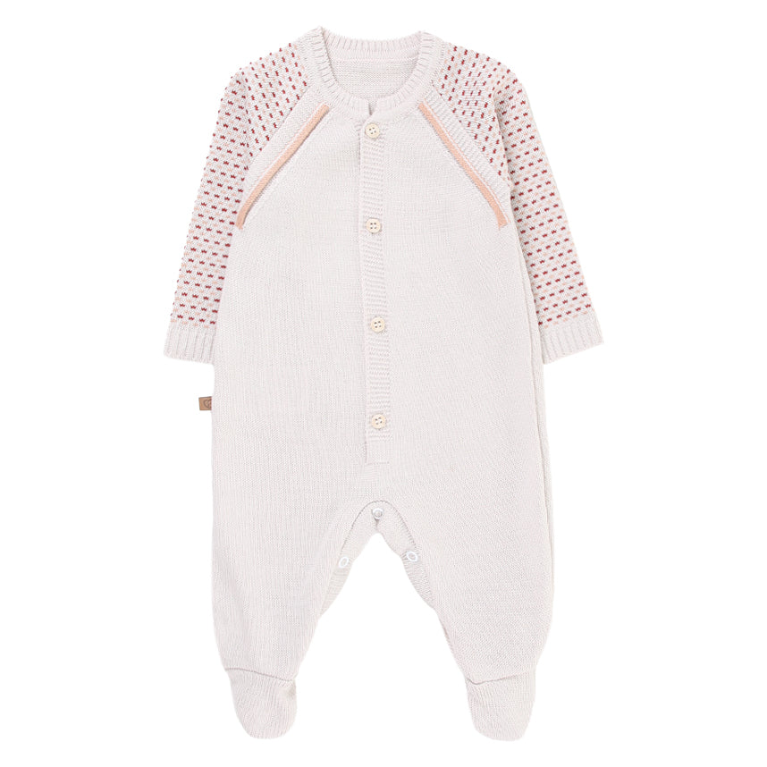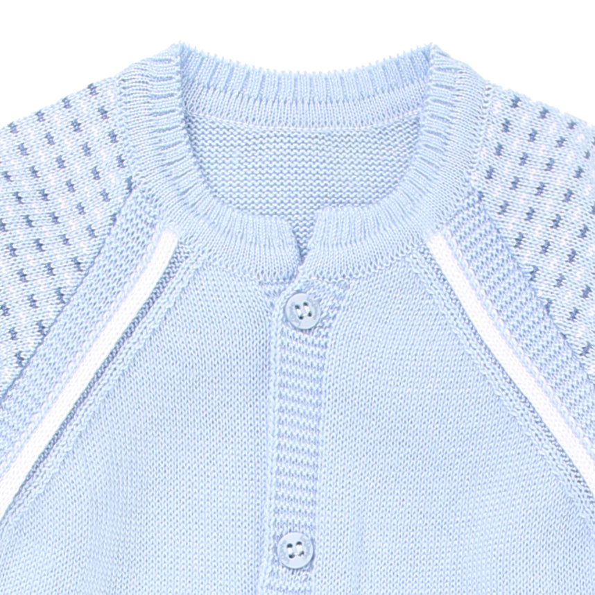 Macacão longo confeccionado em tricot macio, proporcionando conforto e aconchego para o bebê. O design moderno combina cores suaves e detalhes vazados nas mangas e ombros, deixando o look delicado e sofisticado.