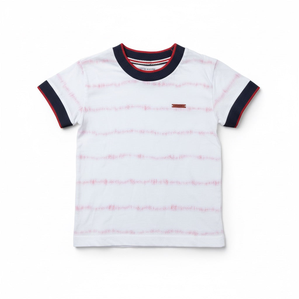 Conforto e estilo para o dia a dia! A camiseta infantil da Biogás é confeccionada em malha de algodão macia, com estampa em efeito tie dye discreto em vermelho sobre o fundo branco. Possui gola e punhos em azul marinho com detalhe em vermelho, trazendo um toque moderno e despojado. Ideal para compor looks casuais e fresquinhos, garantindo liberdade de movimentos para os pequenos.