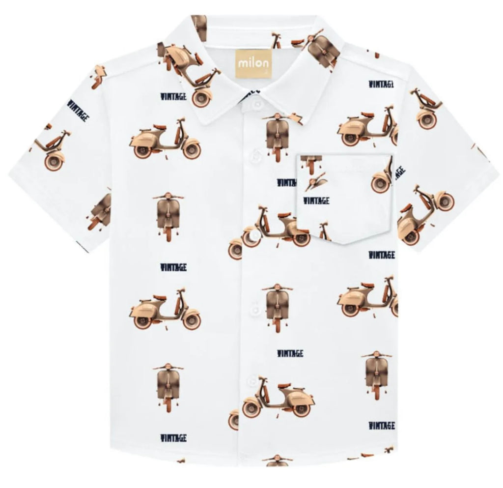 A camisa infantil da Milon é perfeita para deixar os meninos cheios de estilo em qualquer ocasião. Confeccionada em tecido leve e confortável, possui estampa divertida de scooters vintage, gola tradicional, botões frontais e bolso aplicado. Ideal para compor looks charmosos, tanto para passeios quanto para momentos especiais.